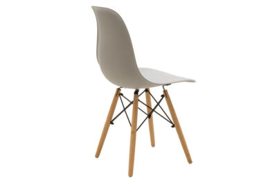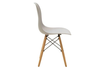 Μία μοντέρνα καρέκλα κατασκευασμένη από ξύλινο σκελετό και κάθισμα πολυπροπυλενίου σε γκρι απόχρωση.
