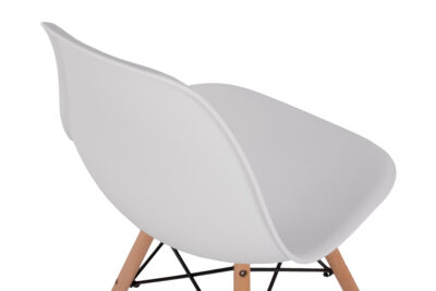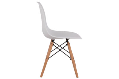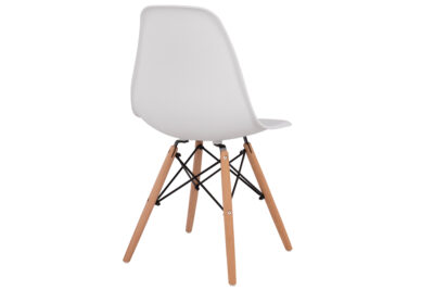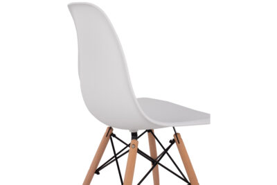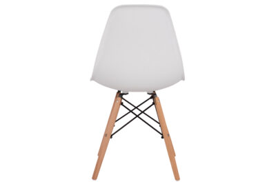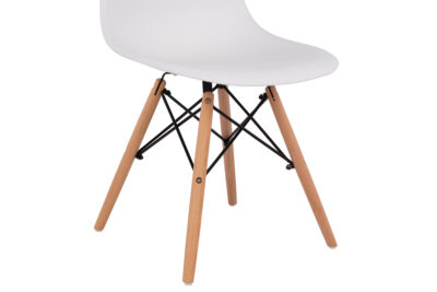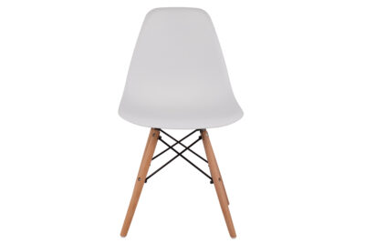 Μία μοντέρνα καρέκλα κατασκευασμένη από ξύλινο σκελετό και κάθισμα πολυπροπυλενίου σε λευκή απόχρωση.
